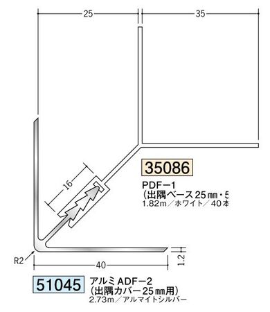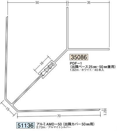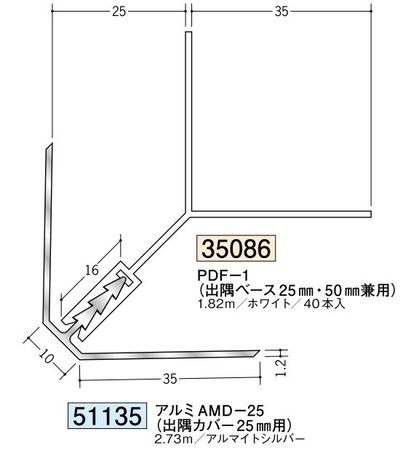 アルミ 断熱材用ジョイナー出隅 アルミAMD-50(出隅カバー25mm用/アルマイトシルバー長さ2.73m)・PDF-1(H型ベース25・50mm兼用/ホワイト長さ1.82m)価格: 1,035円 (税別) 〜