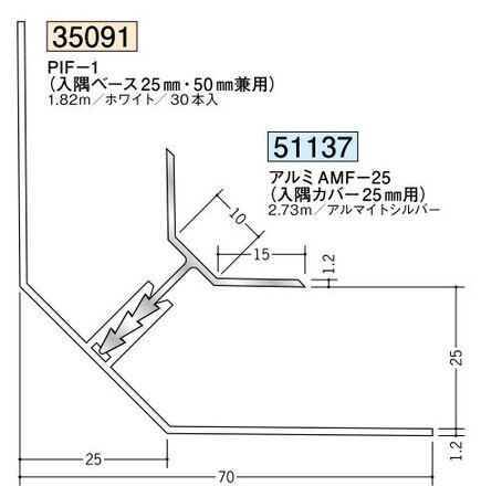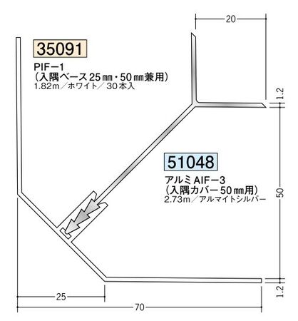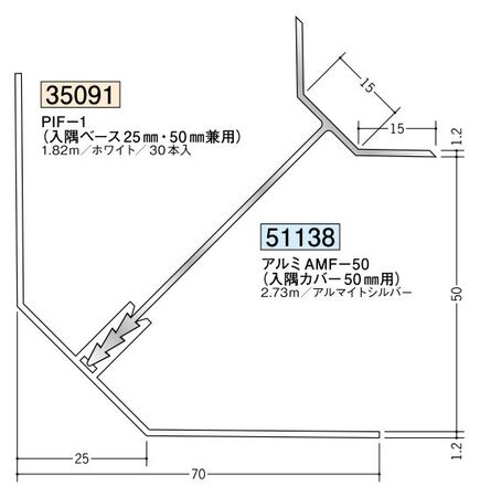 アルミ 断熱材用ジョイナー入隅 アルミAMF-50(入隅カバー50mm用/アルマイトシルバー長さ2.73m・PIF-1(H型ベース25・50mm兼用/ホワイト長さ1.82m)価格: 1,085円 (税別) 〜