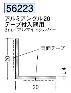 アルミ製テープ付アングル(等辺) アルミアングル20テープ付入隅用 アルマイトシルバー 長さ3m創建