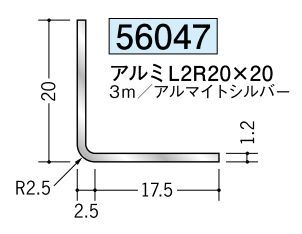 アルミ製R付アングル(等辺) アルミL2R20×20 アルマイトシルバー 長さ3m創建