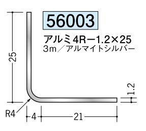 アルミ製R付アングル(等辺) アルミ4R1.2×25 アルマイトシルバー 長さ3m創建