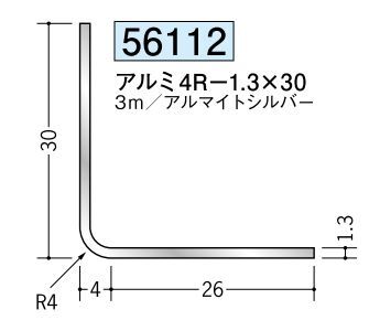 アルミ製R付アングル(等辺) アルミ4R1.3×30 アルマイトシルバー 長さ3m創建