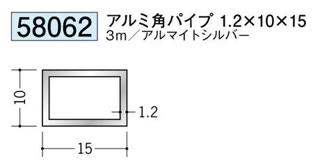 アルミ製角パイプ アルミ角パイプ1.2×10×15 アルマイトシルバー 長さ3m